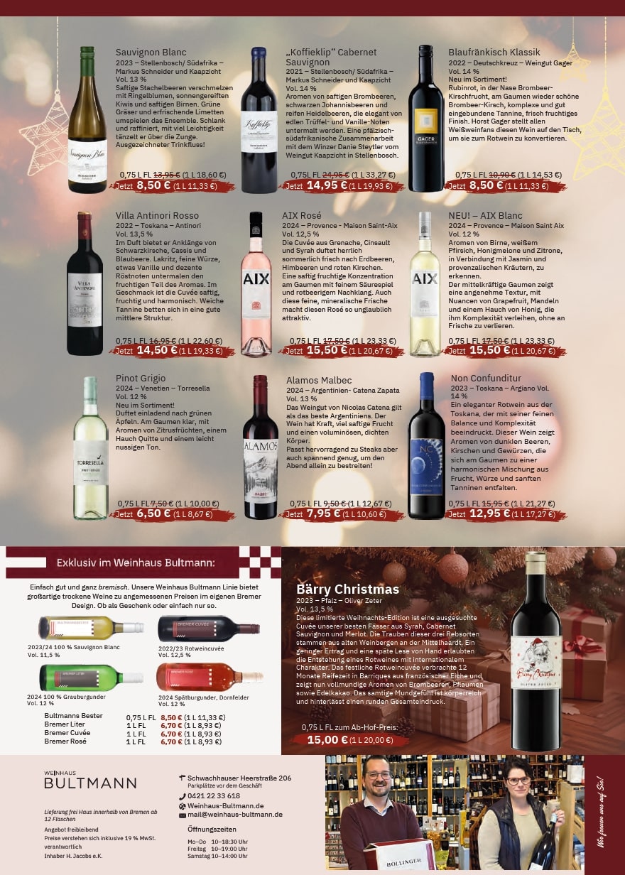 In Bremen-Schwachhausen bieten wir im Ladengeschäft Spitzenweine und erlesene Sorten wie den Rotspon und viele weitere Sorten. Machen Sie sich selbst einen Eindruck von unserem Service und besuchen Sie uns zu unseren Öffnungszeiten: